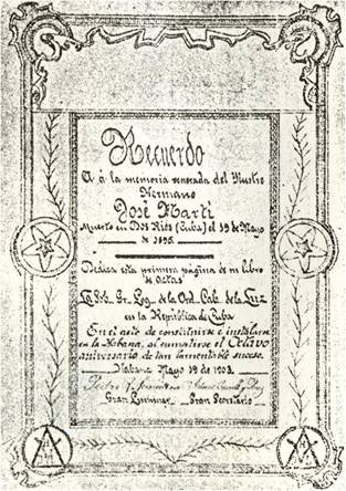 En esta sesión, que es histórica porque se trató de vitalizar la incipiente labor fraternal, se tomó el acuerdo, por aclamación, de dedicar la primera página del Libro de Actas, como homenaje de admiración y respeto, a la augusta memoria de nuestro Hermano y Apóstol, José Martí.