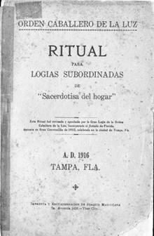 Asimismo se imprimió por el Taller Tipográfico de Castro y Rolo; Whitehead y Petronia otra edición del Ritual para Logias Subordinadas de Sacerdotisas del Hogar, aprobado durante la Gran Convención de 1915. Cuando la candidata hacía la señal de juramento todas las hermanas alrededor la hacían también.