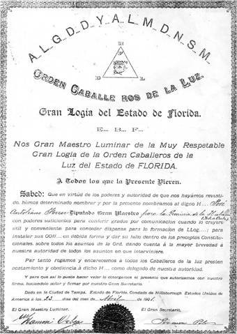 “Nos Gran Maestro Luminar de la Muy Respetable Gran Logia de la Orden Caballeros de la Luz del Estado de FLORIDA”.